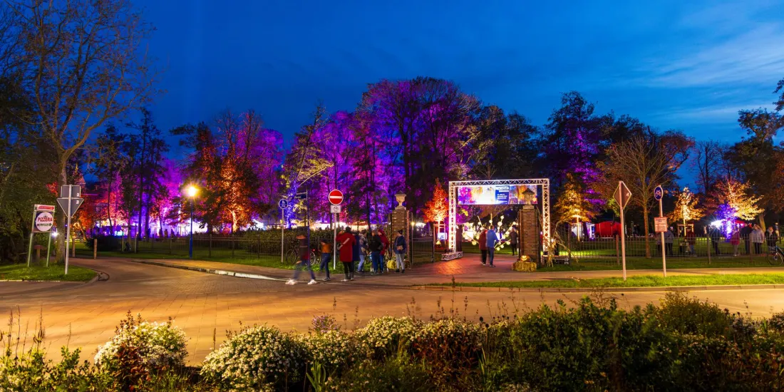 Wenn die Baumriesen in farbiges Licht getaucht wie filigrane Wesen aussehen, Feuerfackeln im Wind flackern und der Geruch von Apfelpunsch und gebackenem Stockbrot in die Nase ziehen, dann feiern wir das Lichterfest im historischen Sielhof-Park.