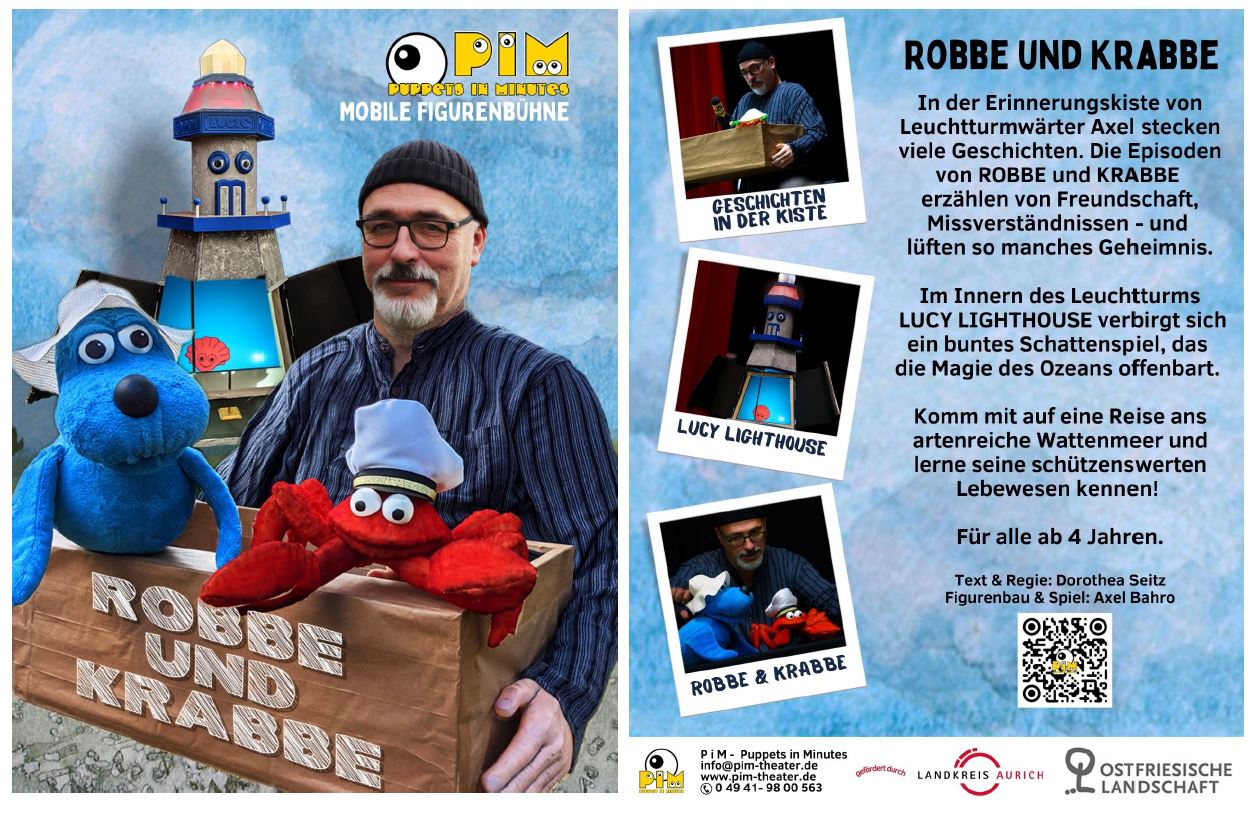 ​Aufregende Abenteuer im Wattenmeer verspricht das Kinderfigurentheater „Robbe & Krabbe“, das in den kommenden Wochen bei TABULA MAGICA Cultur im Centrum in Varel, Neue Straße 6, gastiert. Das Figurentheaterspiel der „Puppets in Minutes“ aus Aurich nimmt kleine und große Gäste mit auf eine spannende Reise ans artenreiche Wattenmeer. Wenn Leuchtturmwärter Axel in seiner Erinnerungskiste kramt, findet er nicht nur lustige Geschichten von Robbe und Krabbe, sondern erkundet auch gemeinsam mit ihnen verborgene Unterwasser-Geheimnisse.