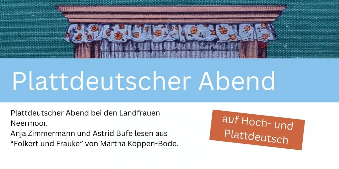 Am 08.09.2025 laden die Landfrauen Neermoor ins Bürgerhaus Neermoor ein. Anja Zimmermann und Astrid Bufe lesen aus dem Buch „Folkert und Frauke“ auf Hoch- und Plattdeutsch. Im Eintrittspreis von 7,00 € sind Tee und Schnittchen inbegriffen.