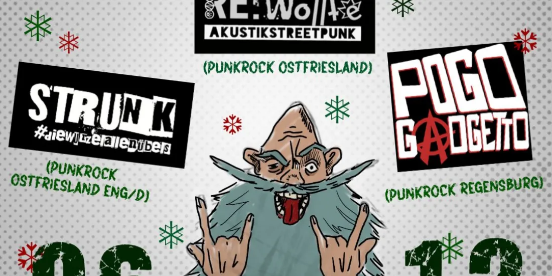Am 06. Dezember trifft Energie auf Haltung: Der Nikolaus Krawall im JUZ Schlachthof Aurich positioniert sich klar gegen Rechts – mit drei Acts voller Herz, Haltung und Druck: Pogo Gadgetto, Strunk und RE:Wollte.