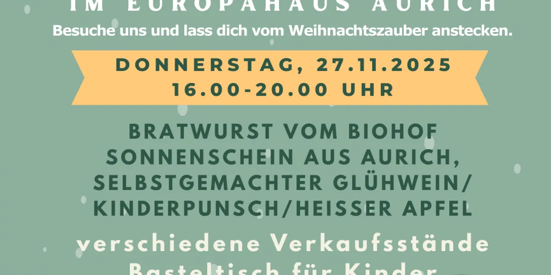 Am 27.11.2025 von 16 bis 20 Uhr lädt das Europahaus Aurich zur Lüttje Wiehnacht ein. Auf dem gemütlichen Weihnachtsmarkt im historischen Innenhof des Europahaus gibt es an diesem Tag verschiedene Stände, bei denen unter anderem künstlerische und regionale Produkte angeboten werden. Dazu zählt beispielsweise die Imkerei Bogena, die Künstlerin Mareke Bokelmann aus Norden oder der Weltladen Aurich. Für das leibliche Wohl ist durch Bratwürste vom Biolandhof Sonnenschein, selbstgemachte Waffeln und heiße Getränke gesorgt. Ein Chor wird die Lüttje Wiehnacht musikalisch begleiten. Für Kinder gibt es ein Bastelangebot, unter anderem Weihnachtssterne und Lebkuchenherzen.