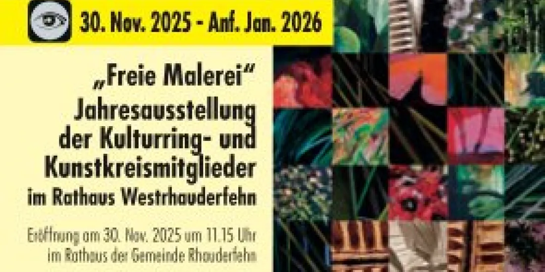 Der Kulturring und der Kunstkreis Rhauderfehn laden herzlich zur diesjährigen Jahresausstellung im Rathaus Rhauderfehn ein. Unter dem Thema „Freie Malerei“ präsentieren die Künstlerinnen und Künstler ihre neuesten Werke, die durch Vielfalt, Kreativität und persönliche Ausdruckskraft bestechen.