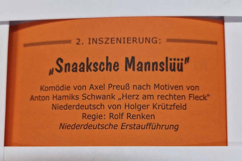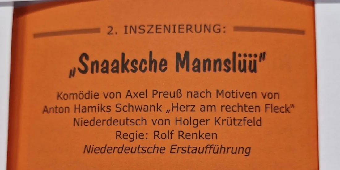 Komödie von Axel Preuß (nach Motiven von Anton Hamiks Schwank `Herz am rechten Fleck`) Niederdeutsch von Holger Krützfeld Regie: Rolf Renken Niederdeutsche Erstaufführung Inhalt: Die Brüder Jockel und Didi haben einen herrlichen Gulfhof in Friesland. Ihre Devise aber lautet: "Ümmer suutje - Immer mit der Ruhe!" Statt zu arbeiten, gehen die beiden lieber angeln. Sehr zum Leidwesen ihrer Schwester Irene, die mit ihrem poltrigen Gatten Lutz ein Auge auf den Bauernhof geworfen hat. Die beiden haben Geldsorgen - und eine Tochter: Mandy. Der Plan ist der: Mandy soll Jockel und Didi beerben! Doch dann kommt alles anders. Erst kehrt Mandys Jugendliebe Tom zurück ins Dorf. Als wäre das nicht genug, stellen Jockel und Didi auch noch eine Hauswirtschafterin ein: Henni Fischer. Die macht Dampf - und wie! Den Brüdern passt das gar nicht, schließlich wollen sie ihre Ruhe haben. Und von einer Frau lassen sie sich schon gar nichts sagen. Doch resolut, wie sie nun einmal ist, bringt Henni nicht nur den Hof auf Vordermann, sie heizt auch den beiden alten Faulenzern gehörig ein.