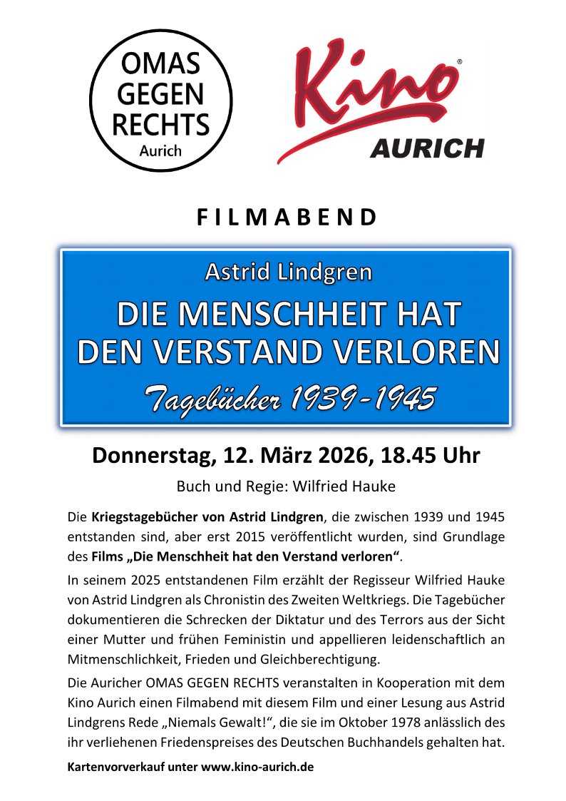 Bei der Veranstaltung handelt es sich um eine Kooperation der OMAS GEGEN RECHTS Aurich mit dem Kino Aurich.
