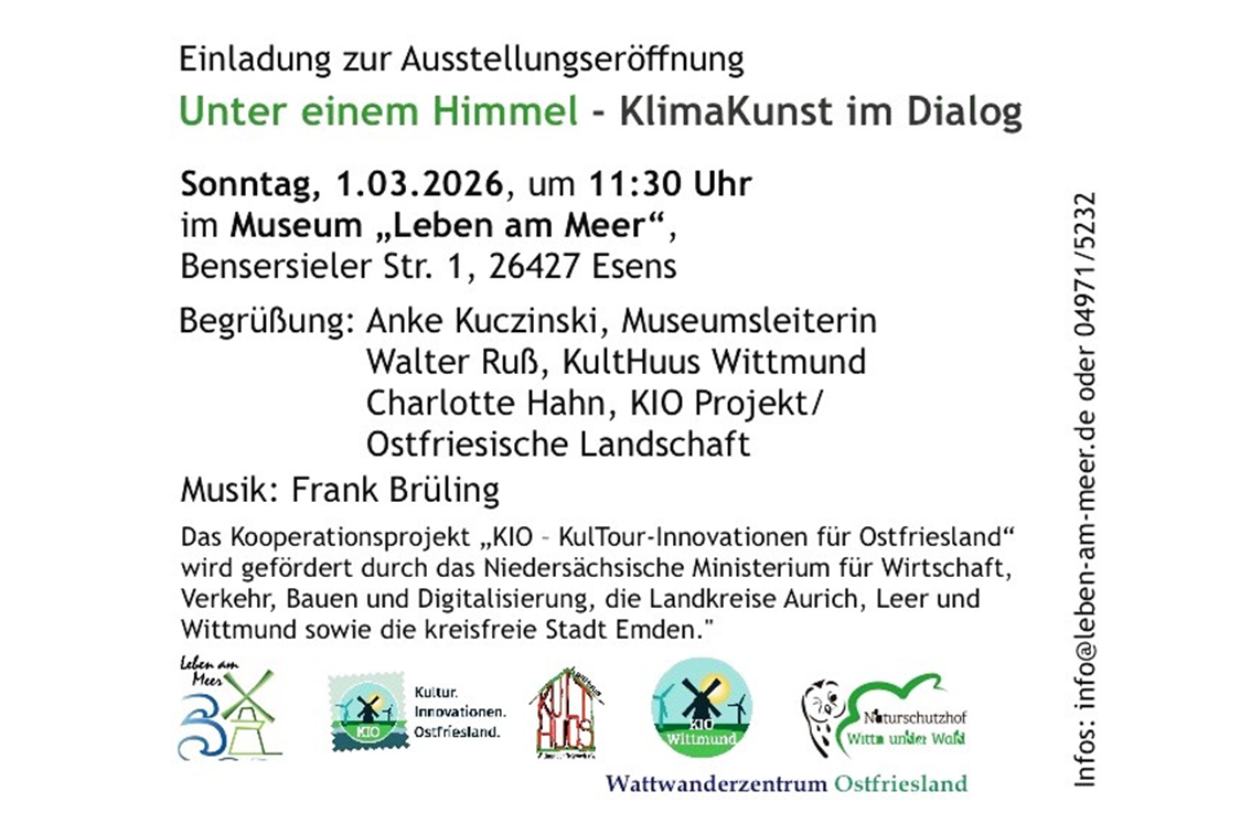 Gemeinsam mit dem Naturschutzhof Wittmund, dem Museum Leben am Meer in Esens und dem Verein Zukunft Wattenland e. V. arbeiten wir in diesem KIO-Projekt für Nachhaltigkeit und Klimabewusstsein in der Kultur im Sinne des von der Ostfriesischen Landschaft geförderten Projektes.