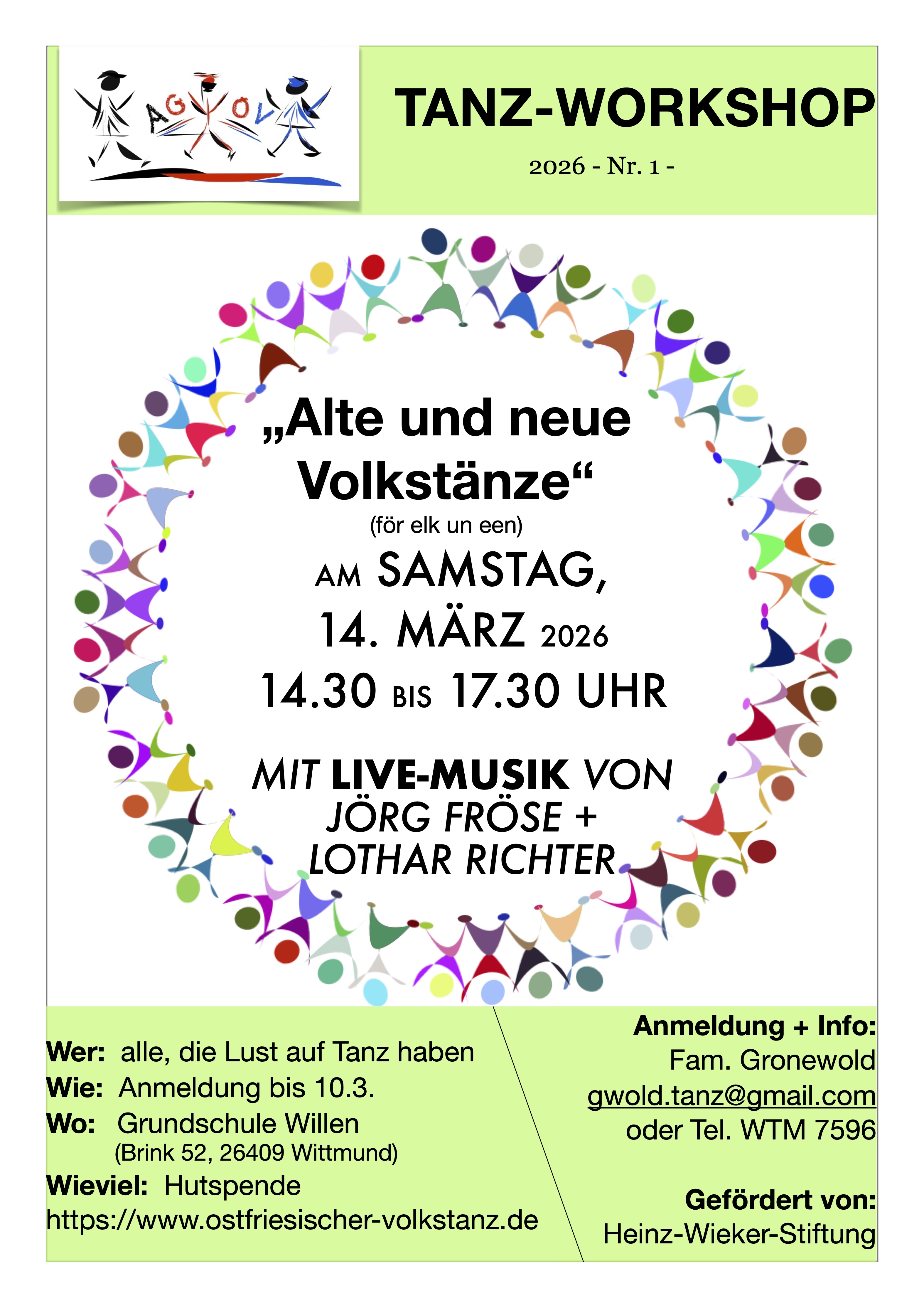 Die Arbeitsgemeinschaft der Ostfriesischen Volkstanz- und Trachtengruppen -AGOV- möchte mit den Workshops die Volkstänze wieder „unters Volk“ bringen und bietet dazu mehrere Workshops an. Ein Tanzpartner muss nicht mitgebracht werden.