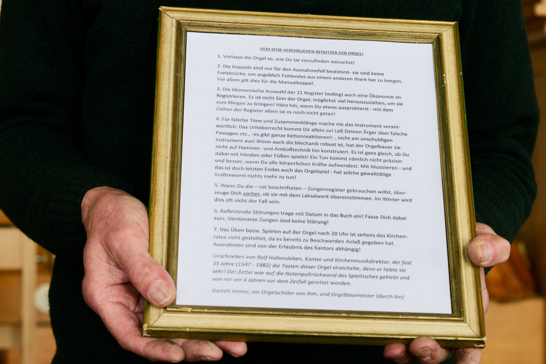 Und dann präsentiert der Norder Orgelbaumeister einen besonderen Schatz, den er schon vor 15 Jahren im Spieltisch fand. Es ist ein DIN A4-Zettel, den Rolf Hallensleben, der von 1947 bis 1982 Organist war und „seine“ Schuke-Orgel besonders liebte, geschrieben hatte. Auf dem Papier notierte der Kirchenmusiker mit trockenem Humor eine „Gebrauchsanweisung“ für die Nutzung der Orgel. „Der Zettel war völlig zerfleddert, und ich habe ihn mitgenommen, neu geschrieben, mit einigen zusätzlichen Informationen versehen und gerahmt.“ Dafür hatte Bartelt Immer Gründe. Denn Hallensleben war sein Orgellehrer, und durch dessen Begeisterung für das Instrument und für die Kirchenmusik kam Immer zu seinem Beruf.