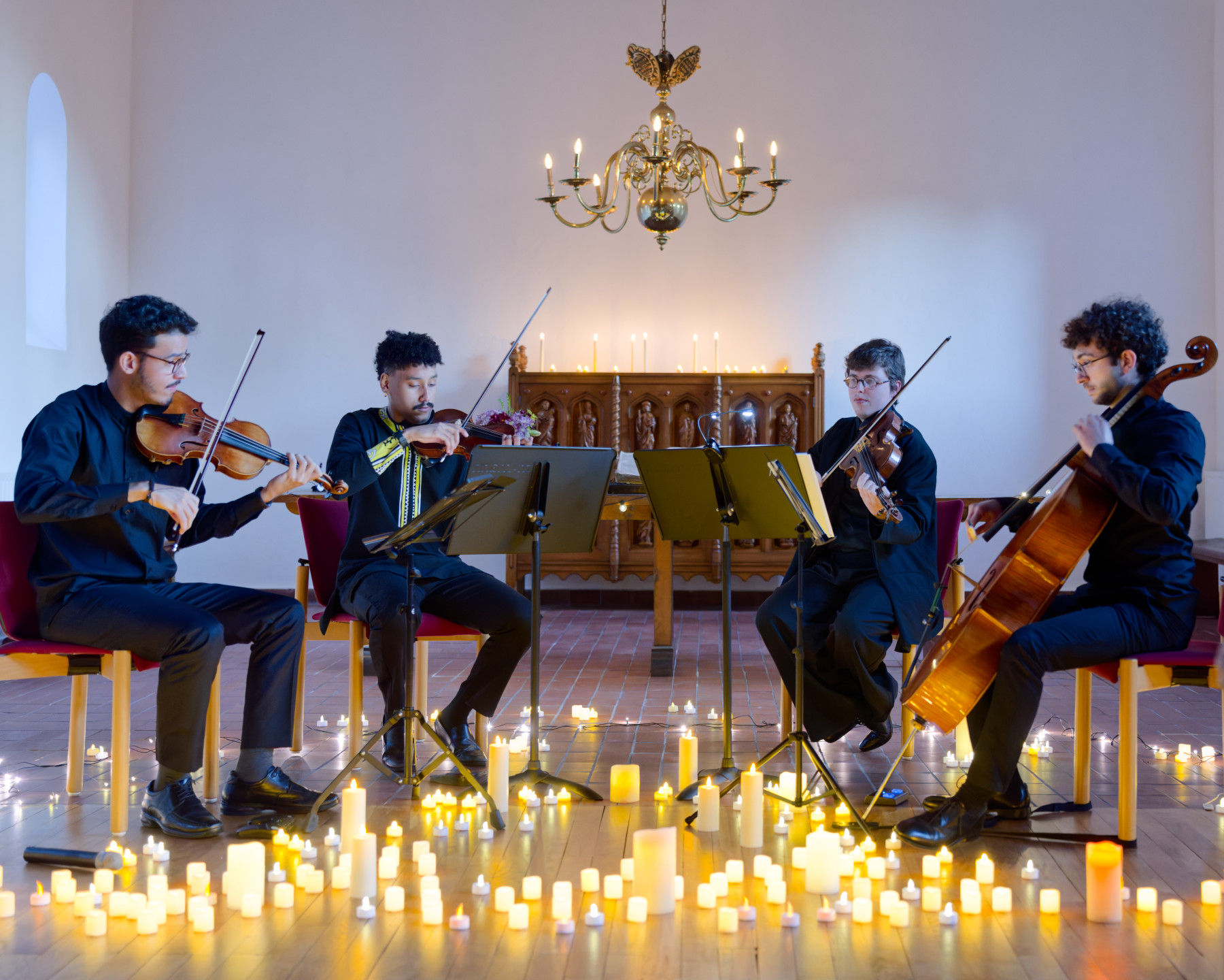 In der annähernd voll besetzten Schweizer Kirche breitete sich schnell Stimmung aus. Die vier Musiker des Hanover-Quartetts spielten, in einem Meer von Kerzen sitzend, ein Programm, das zum Beispiel „Chicquitita“, „Yesterday“, „I have a dream“, „Bohemian Rhapsody“ in sehr ruhigen Arrangements umgriff. Sie schufen mit ihrer Interpretation für Streich-Quartett ein gefühlsbetontes Ganzes. Dynamische Zugriffe waren selten und wurden nur an ausgewählten Positionen eingesetzt. So wirkte das Programm insgesamt etwas flächig, einige lebhaftere Impulse hätten ihm gutgetan.