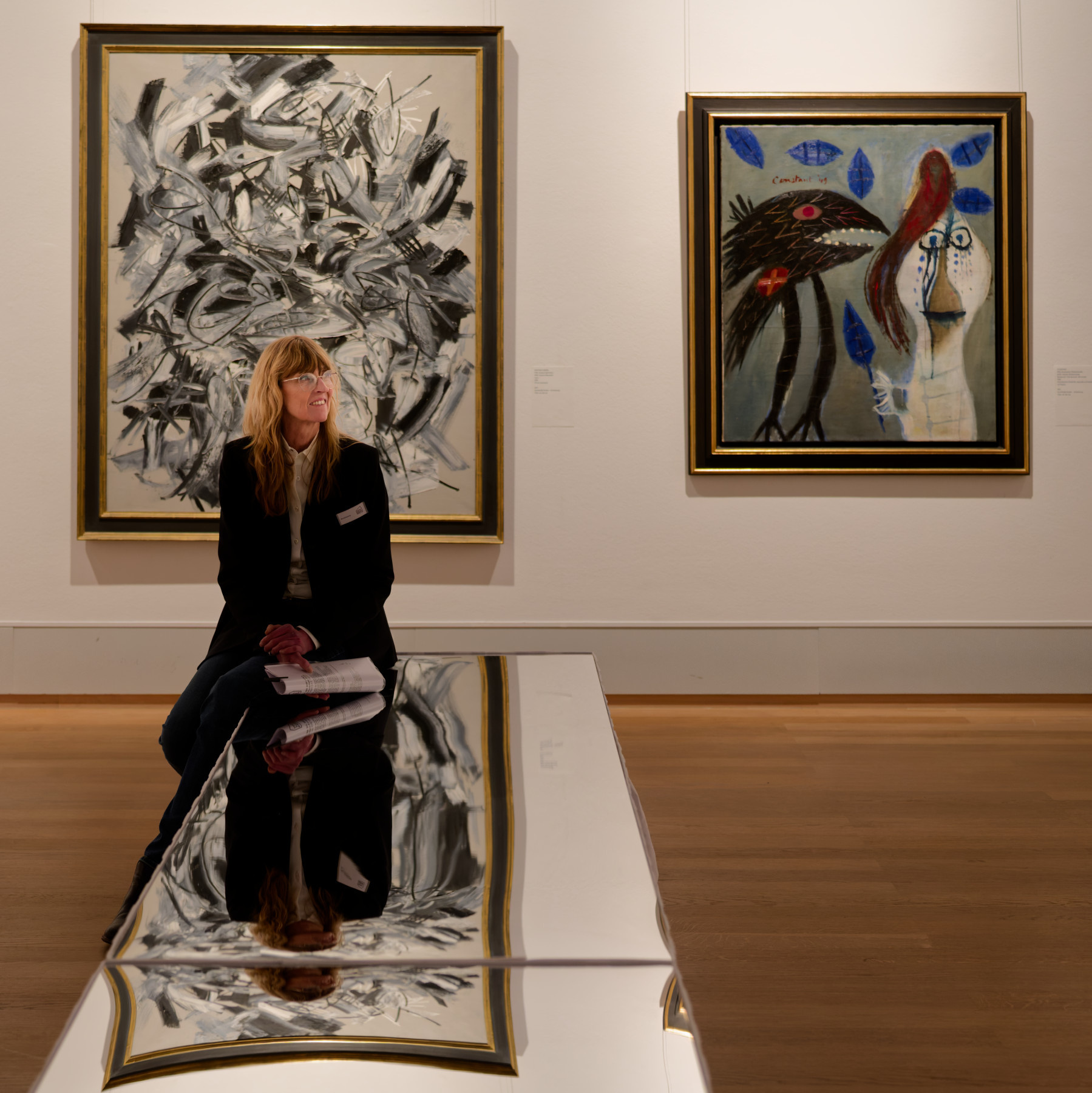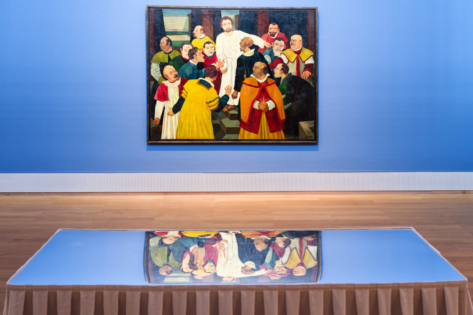 Der Gang durch die Ausstellung vermittelt geradezu heimische Gefühle. Man begegnet sich wieder – und das nicht zum ersten Mal. Da hängen sie an den Wänden: „Quappi im grünen Jumper“ von Max Beckmann, die „Mutter des Nikita“ von Alexej Jawlensky, die „Blauen Fohlen“ von Franz Marc, das „Stehende Mädchen vor Ziegenstall“ von Paula Modersohn-Becker, die „Tänzerin im roten Kleid“ von Emil Nolde, der „Blinde Bettler im Café“ von Josef Scharl. Wie auch die Kunsthallen-Sammlung mit Arbeiten von Hans Trimborn und Asgar Jorn wird von Scharl ein großer Bestand präsentiert, der die Entwicklung des Münchner Malers aufzeigt, der 1938 aus Deutschland emigrierte und nie wieder zurückkehrte. Im Zentrum des Scharl-Raumes steht ein neues Werk in lichtem Blau, ein Porträt seiner Mutter aus dem Jahr 1922. Die Ausstellung präsentiert aber auch Exponate aus der großen Schenkung des Münchner Galeristen Otto van de Loo – Nachkriegskunst mit einem Schwerpunkt auf dem Informel.