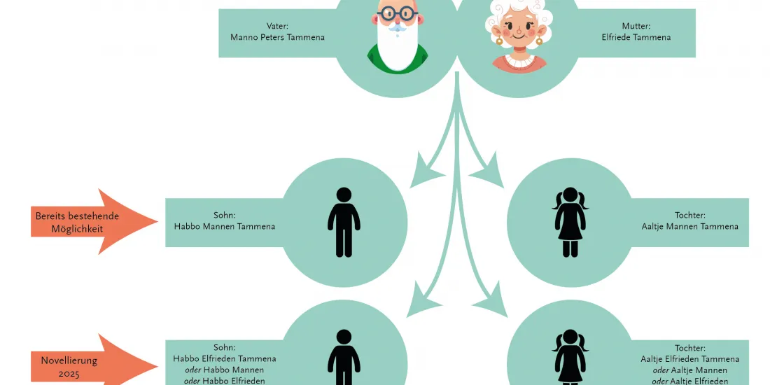 Traditionell wurden die ostfriesischen Nachnamen aus den Vornamen der Väter gebildet, also als patronymische Form. Aus den obigen Beispielen geht es bereits hervor: Durch die Gesetzesnovelle können ab 2025 ausdrücklich auch die Vornamen der Mütter als Nachnamen an ihre Töchter und Söhne weitergegeben werden. Eine matronymische Namensgebung ist also auch möglich.