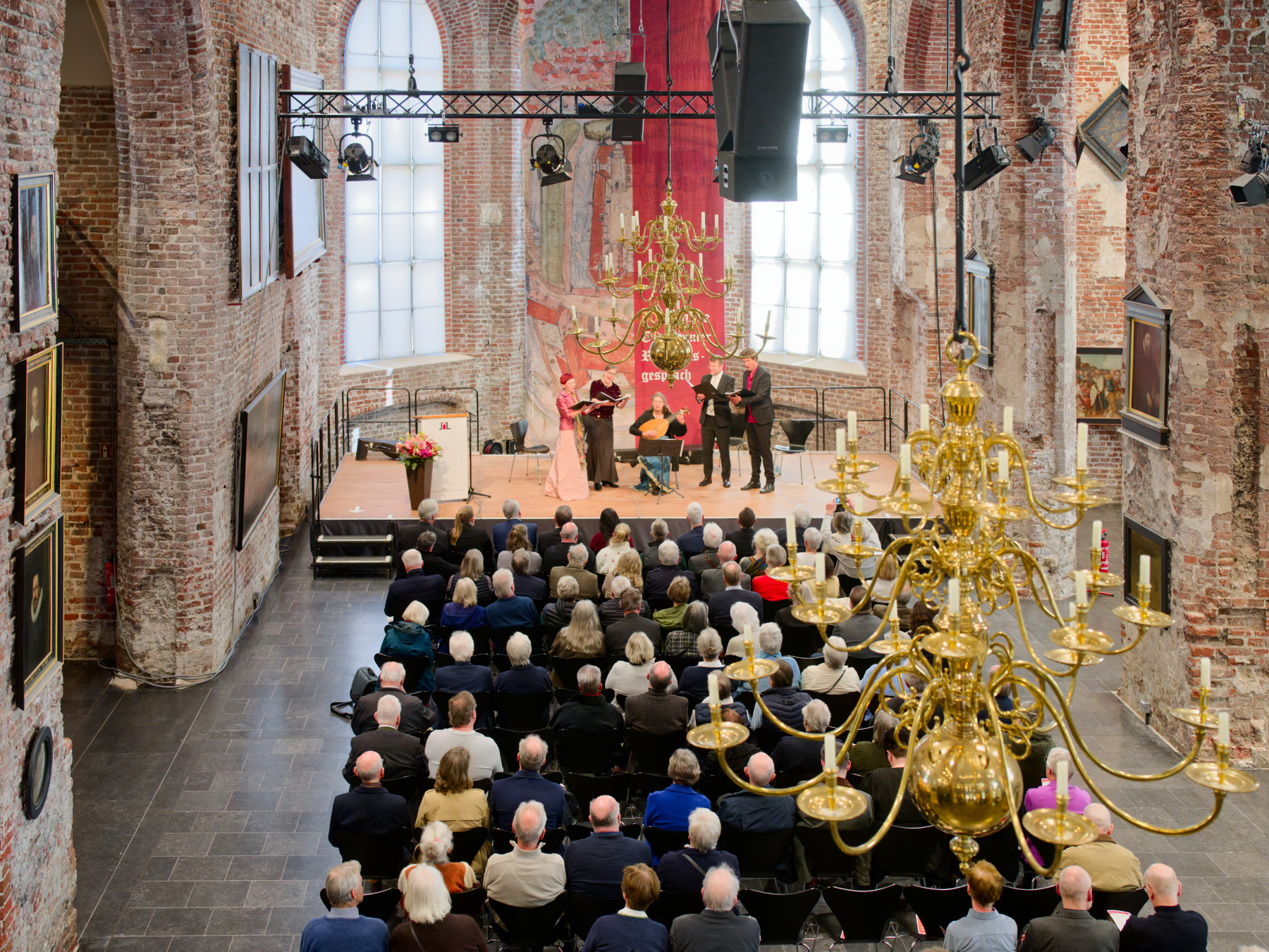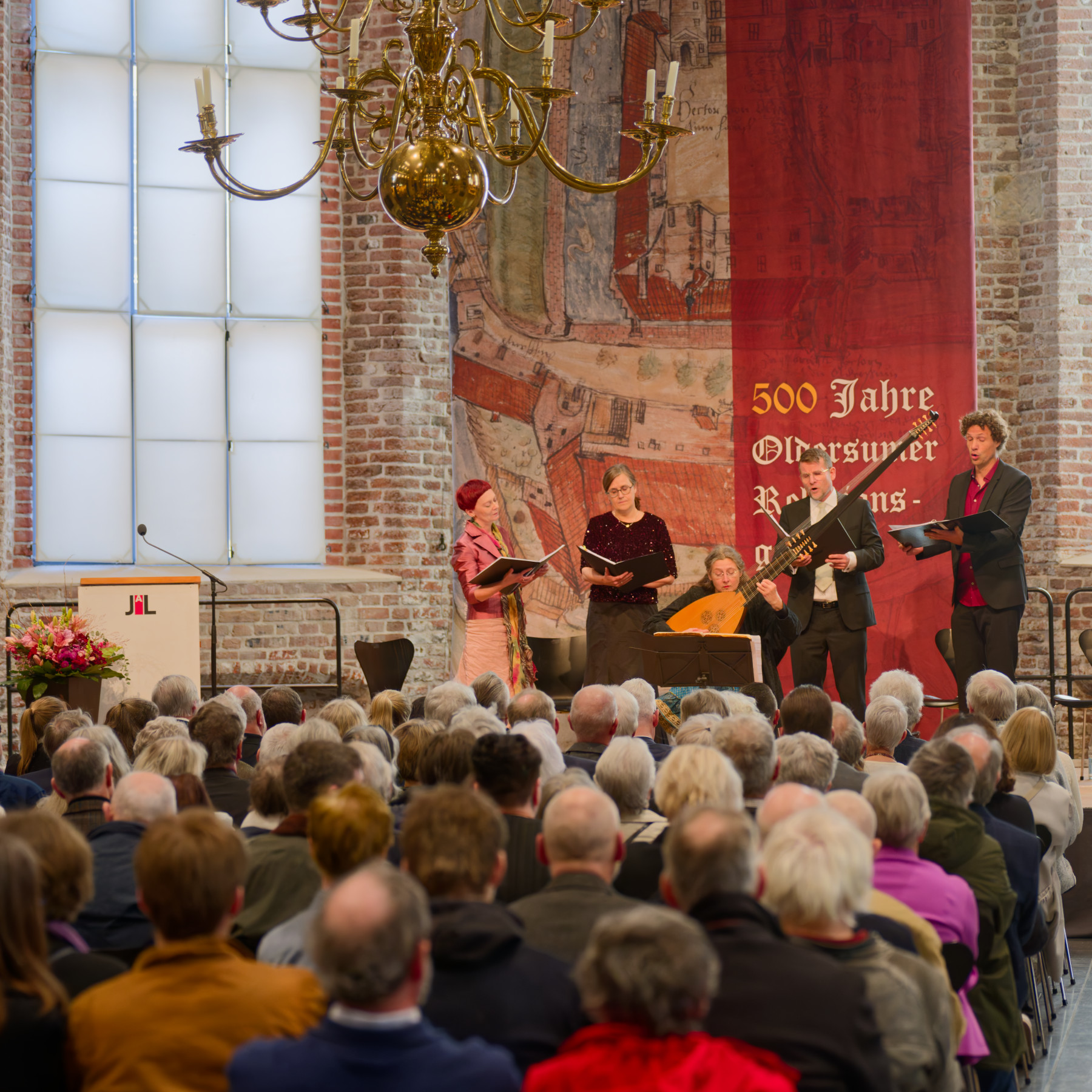 Mit Instrumental- und Vokalwerken aus der Reformationszeit gestaltete ein Ensemble aus vier Stimmen und einer Theorbe eine Sonntagsmatinée, die sich charmant zwischen die Ansprachen schob und immer wieder deutlich machte, dass die Musik der Reformationszeit vielerlei Emotionen beherrschte. Rund um eine Mottete von Ludwig Senfl aus dem 15. Jahrhundert mit dem lockeren Titel „Schau mal, wie gut“ spannte sich der Bogen über Monteverdi (Im Licht der Sterne), Dowland (Komm, süße Liebe), Gastoldi (Diese süße Meerjungfrau) bis hin zu Dowlands „Fine Knacks for Ladies“ (Feine Dinge für Damen) und setzten so einen weiteren Akzent. Denn die Reformation war nicht nur Theologie. Zur zarten Begleitung von Theorbe oder Renaissancelaute, die Gerlind Puchinger spielte, setzten die Stimmen von Vilma Pigagaitė (Sopran), Katharina Padrok (Alt), Jens Lauterbach (Tenor) und Daniel Kemminer (Bass) ein Statement. Das war eindrucksvoll und wohlklingend und stellte die Epoche in ein variantenreiches Licht.