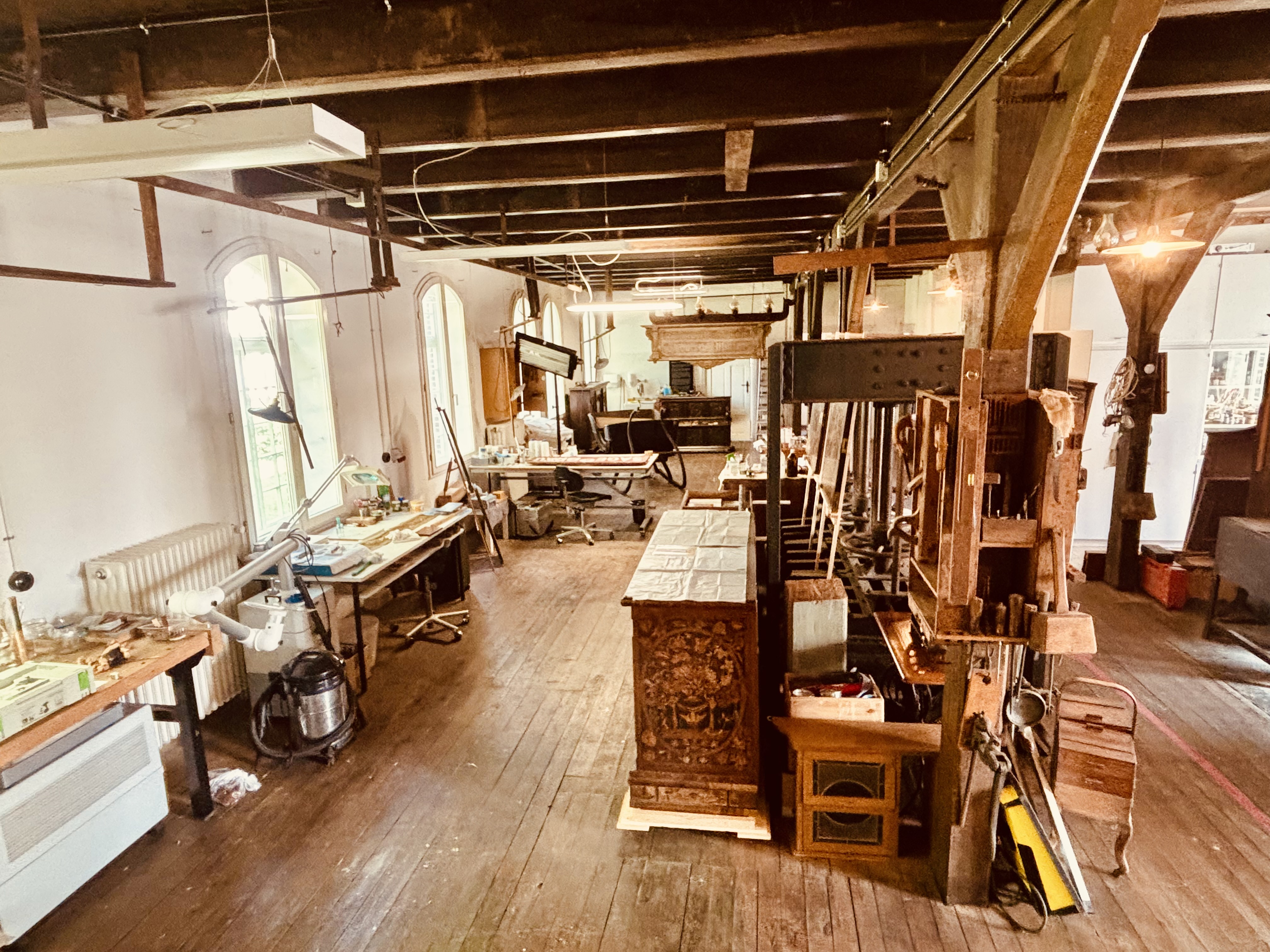 Der Betreiber der Restaurierungswerkstatt führt nach Absprache auch Besuchergruppen durch die Ausstellung mit ihrem alten Möbel- und Werkstattbestand.