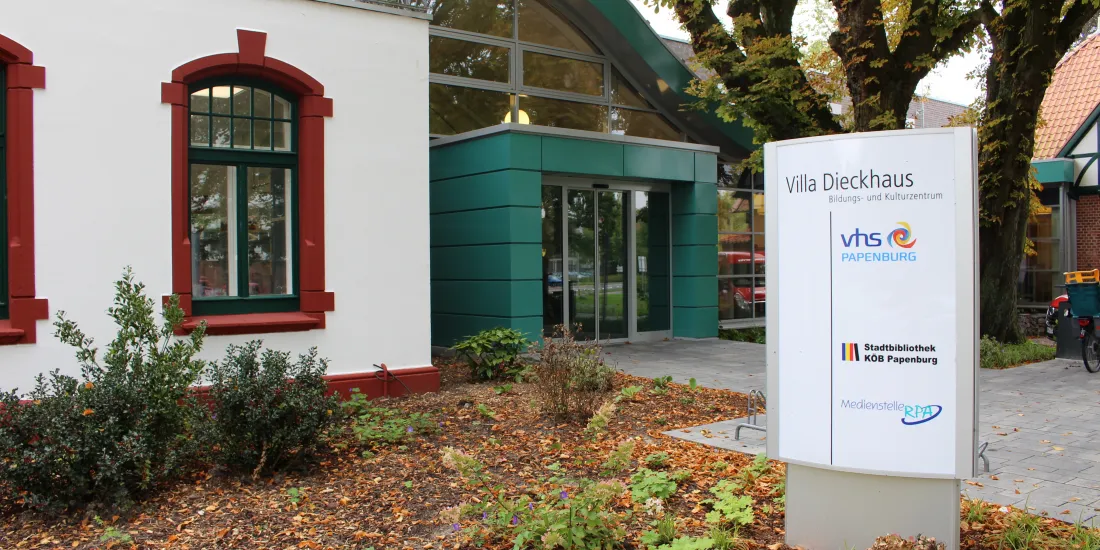 Auf 3662 qm befinden sich u. a. 2 Bewegungsräume, 4 EDV-Räume sowie eine Übungsküche. Die insgesamt 21 Seminarräume unterschiedlichster Größe sind mit elektronischen Flipcharts und Whiteboards (Smartboards) sowie W-LAN ausgestattet. Alle Räume des Neubaus sind barrierefrei über einen Aufzug erreichbar. Im Gebäudekomplex befindet sich ebenfalls unsere Großtagespflege "vhs-kids", die Stadtbibliothek (KÖB) die Medienstelle (RPA) sowie unser Café-Bistro Kutscherhaus.