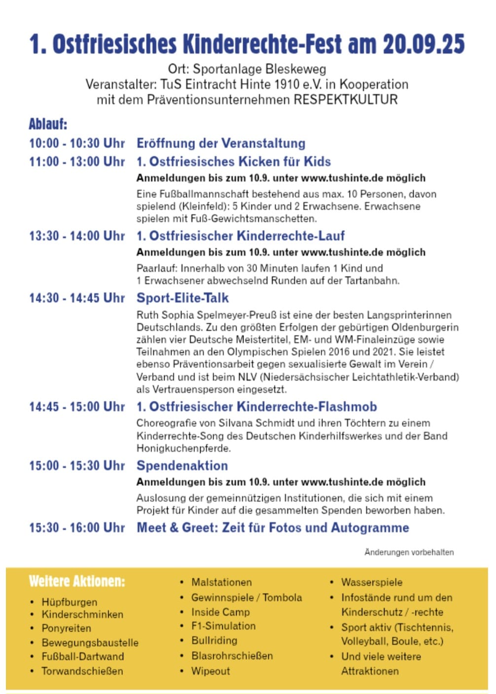 „Beides zusammenzubringen – den Weltkindertag und unser Engagement für Kinderrechte – hätte nicht besser passen können“, freut sich Anne Thonicke, Geschäftsführerin des TuS Hinte. „Wir möchten ein starkes Zeichen für die Kinder, unseren Verein und die Region setzen.“ Seit dem vergangenen Jahr setzt sich der Verein aktiv für Kinderschutz und Gewaltprävention ein – mit einem Verhaltenskodex, Workshops, Vertrauenspersonen und einem neuen Schutzkonzept. Nun geht man mit dem Fest den nächsten großen Schritt.