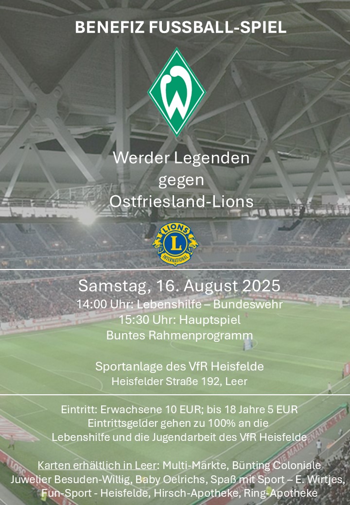 Am 16.08. richtet der Lions-Club Leer / Ems-Leda-Jümme ein Benefiz-Fußballspiel gegen die Werder-Legenden aus. Vorspiel ist um 14 Uhr: Bundeswehr gegen die Lebenshilfe; das Hauptspiel - eine Lions-Auswahl gegen die Werder-Legenden startet um 15:30 Uhr. Auf dem Nebenplatz finden Kinderspiele statt. Für Essen und Trinken ist gesorgt. Die Werder-Legenden kommen u.a. mit Ailton, Nelson Valdez, Frank Ordenewitz, Dieter Eilts und vielen anderen bekannten Spielern. Der Erlös der Aktion kommt zu 100% der Lebenshilfe und der Jugendarbeit des VfR Heisfelde zugute.