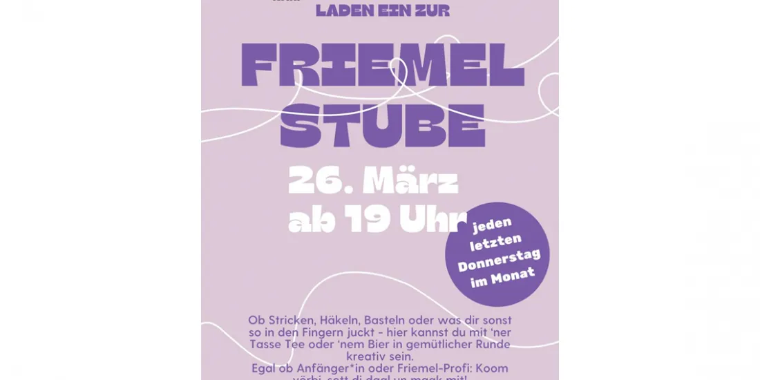 Ob Stricken, Häkeln, Basteln oder was dir sonst so in den Fingern juckt - hier kannst du mit 'ner Tasse Tee oder 'nem Bier in gemütlicher Runde kreativ sein. Egal ob Anfänger*in oder Friemel-Profi: Koom vörbi, sett di daal un maak mit!