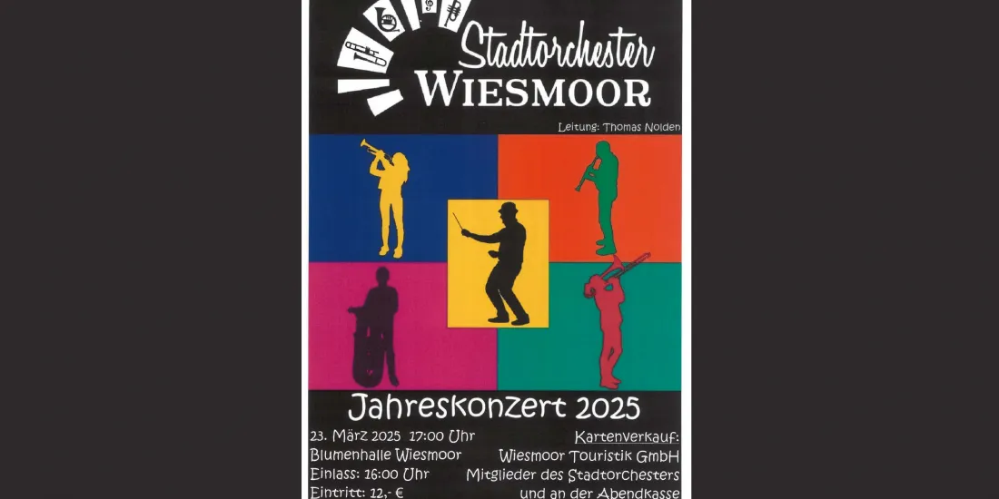 Das Jahreskonzert des Stadtorchester Wiesmoor findet auch in diesem Jahr wieder in der Blumenhalle statt. Sichert euch eure Tickets im Vorverkauf in der Tourist Information, bei den Mitgliedern des Stadtorchesters oder an der Abendkasse.Einlass ab 16 Uhr.