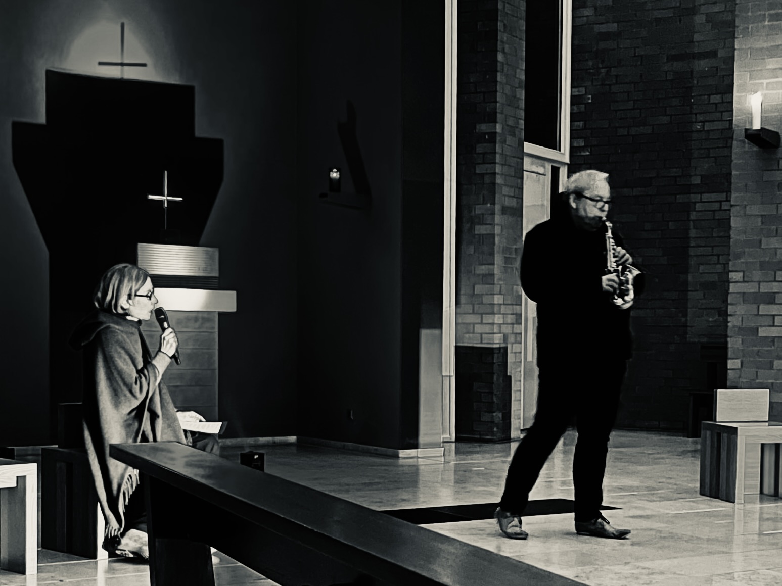 Am Sonntag hingegen war die Zeit von Ellen Zitzmann und Frank Lienemann durch ein ganz besonderes Programm geführt zu werden. Die Germanistin, Musik-, Sprachwissenschaftlerin und Künstlerin führte die still-andächtigen Gäste in 60 Minuten durch eine Berg- und Talfahrt der Gefühle mittels andächtig mystischen Worten und eindringlichen Klängen aus dem Saxophon. Herr Lienemann ist ein begnadeter Improvisator und liebt die Begleitung der kunstvoll inszenierten Beiträge mit kraftvollen Klängen auf seinem klassischen Jazz-Instrument.