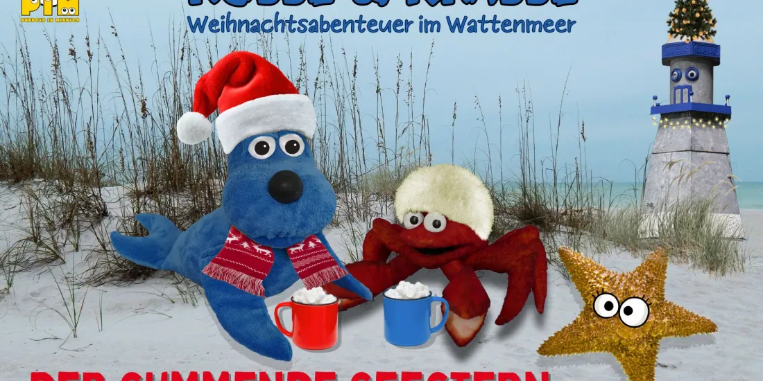 Rund um den Leuchttum LUCY LIGHTHOUSE sind alle in Weihnachtsvorbereitungen: Leuchtturmwärter AXEL hat den Baum geholt, ROBBE übt Weihnachtslieder und KRABBE befestigt die Lichterkette mit funkelnden Sternen.